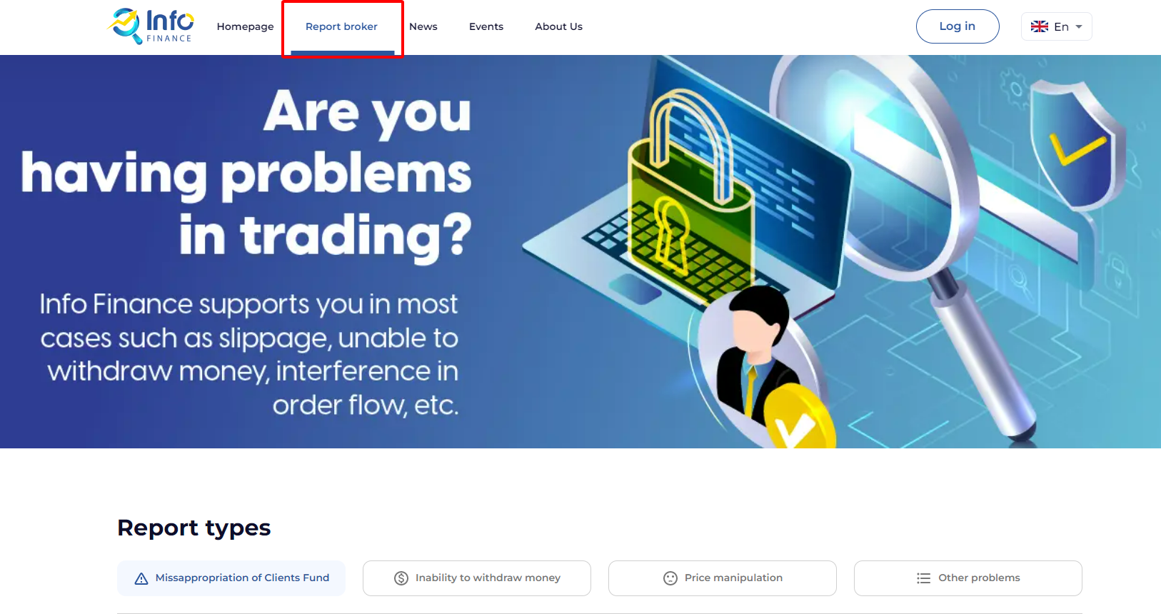 Bước 2: Click chọn mục Report Broker/ Khiếu nại sàn ngay trên trang chủ website