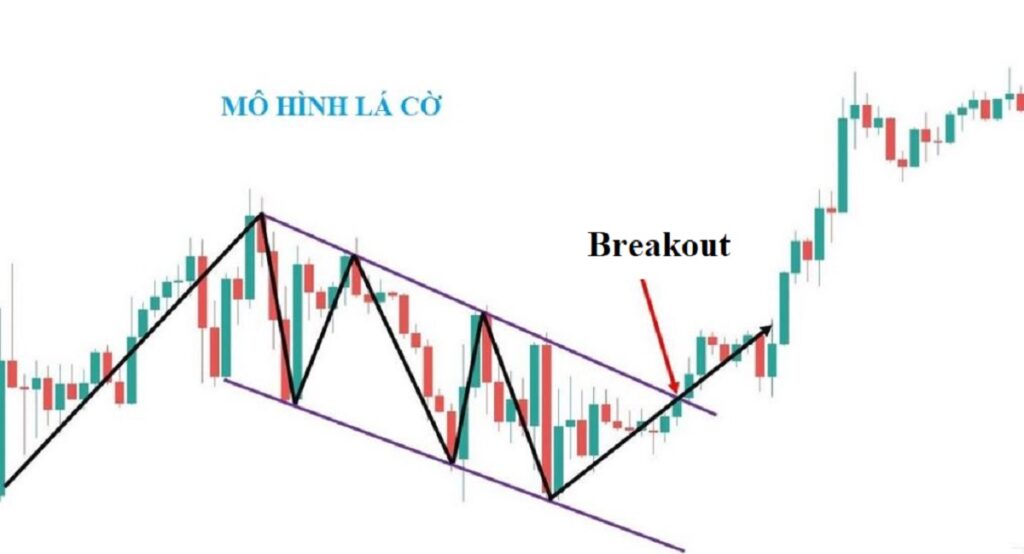 - Phần lá cờ – Giai đoạn điều chỉnh, tích lũy: Cấu tạo lá cờ giống với mô hình chữ nhật và các kênh xu hướng. Gồm một đường hỗ trợ và một đường kháng cự song song nhau. Thời điểm giá break out khỏi đường hỗ trợ hoặc kháng cự sẽ là điểm đánh dấu sự hoàn thiện của mô hình.