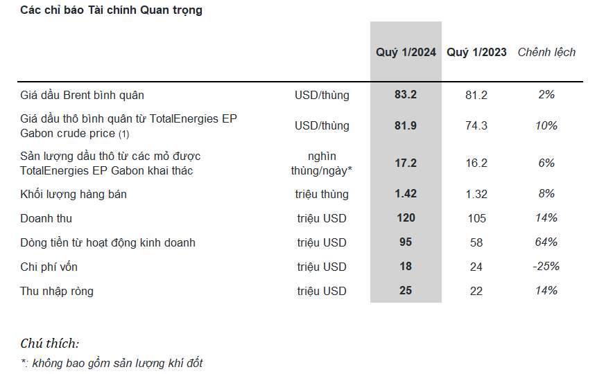 Sản lượng dầu thô của Total Gabon trong quý I/2024 là 17,2 triệu thùng dầu mỗi ngày (Kb/d) tăng so với mức 16,2 Kb/d của quý I/2023, nhờ quy trình nén khí tốt hơn ở hai giếng dầu Torpille và Anguille, cùng kết quả tích cực của dự án can thiệp bằng Bộ phận Kéo (Pulling Unit), bù đắp cho sự sụt giảm tự nhiên của giếng.
