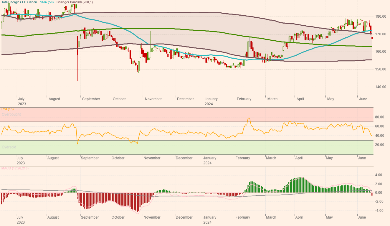 Theo quan sát, chỉ báo trung bình hội tụ phân kỳ (MACD) của cổ phiếu EC là 16,10 EUR, đường trung bình động 20 ngày và 50 ngày lần lượt là 153,50 EUR và 122,62 EUR, trong khi đó giá cổ phiếu hiện vào khoảng 169 EUR.